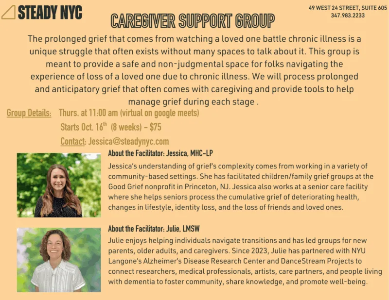 Caregiver Support Group For more information or to schedule a consultation please contact Jessica@steadynyc.com